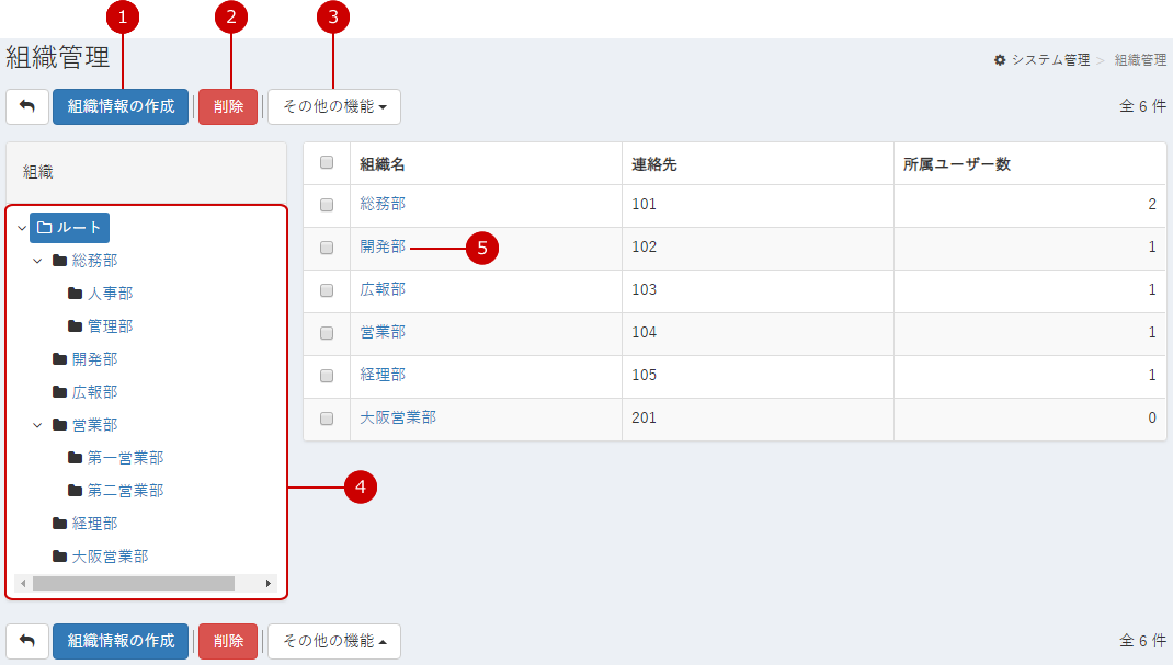 サイドメニューの組織管理メニューにある 組織管理 リンクをクリックすると、組織管理画面が表示されます。